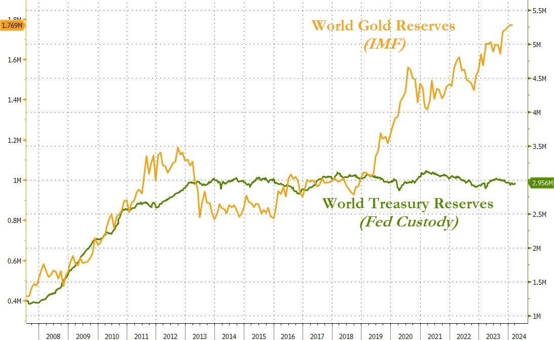 一组对比显示,与长期持平乃至有所缩水全球美债持有量相比,各主权国家近年来正纷纷大举购买黄金以增加黄金储备,这显然已成为了今年以来金价连创新高背后的一大推手。