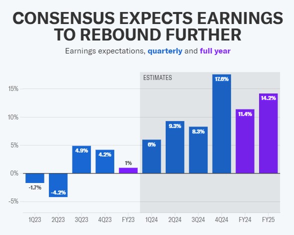 进入新年之际,华尔街的看涨策略师们坚称,今年美股反弹的关键因素将是科技巨头带动下的企业盈利数据的持续反弹趋势。到目前为止,这种情况已经实质发生。2024年第一季度标普500指数成分股的整体每股收益(EPS)同比增长6%,是近两年来的最高增长率。Factset预期数据显示,2024年第四季度整体EPS有望实现同比激增超17%,2024全年EPS增长率有望达到11.4%,整体EPS在2025年则有望增长14%。