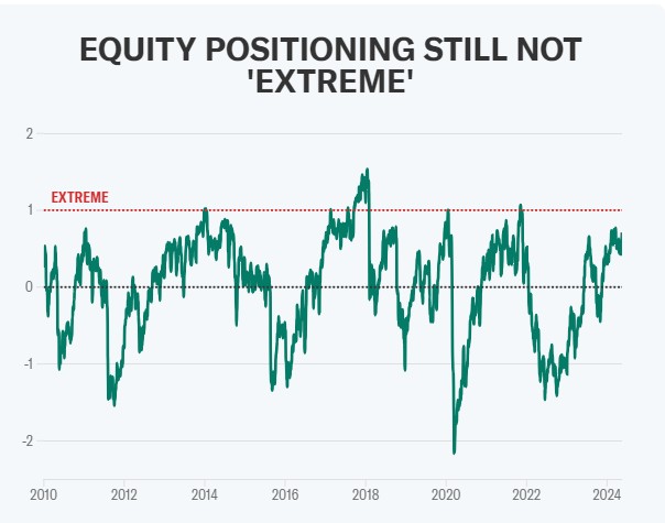 Chadha指出,虽然投资和门都在“谈论看涨话题”,但过去三个月股票头寸并没有发生太大变化。德意志银行所编制的美股头寸衡量指标显示,投资者们继续增持美股,但是远远没有达到2021年和2018年的“极端”水平。