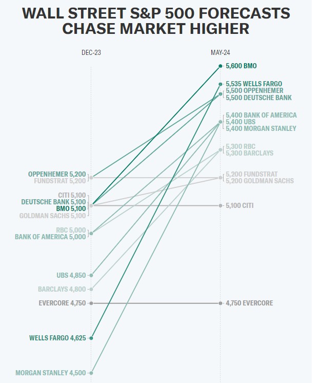 值得注意的是,华尔街知名空头、摩根士丹利首席股票策略师Michael Wilson目前预计美股基准指数——标普500指数到2025年6月之前有望升至5500点(上周该指数收于5304点位)。随着市场持续上涨,这位策略师对2023年的悲观预期未能实现,他最终让步,将标普500指数的目标点从4500点上调至5400点。这使他的预测从华尔街最低的预测之一,一跃成为预计该指数创下新纪录的华尔街最乐观预期之一。