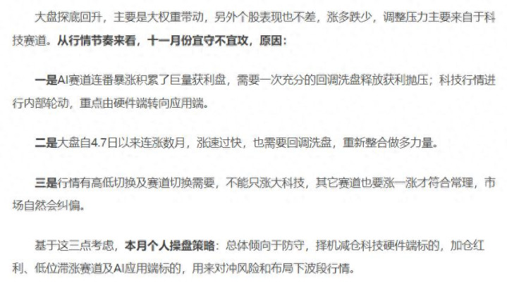 本月震荡调整完全在意料之中,早在11.3日的文章中,黑马就明确指出:十一月份宜守不宜攻,特别强调AI赛道需要一次充分的回调洗盘。